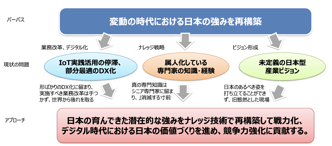 今日の世界では大きな社会変革がはじまり、人間存在の証となる「知」の在り方が問われる中、事業現場では専門人材の知見、知恵の継承が喫緊の課題となっています。我々は、事業の強みを担ってきたが属人化している専門家の知恵、経験知に注目して、これをマネジメントするシステムを実現し、日本の国際競争力を革新する一助となる活動を進めます。