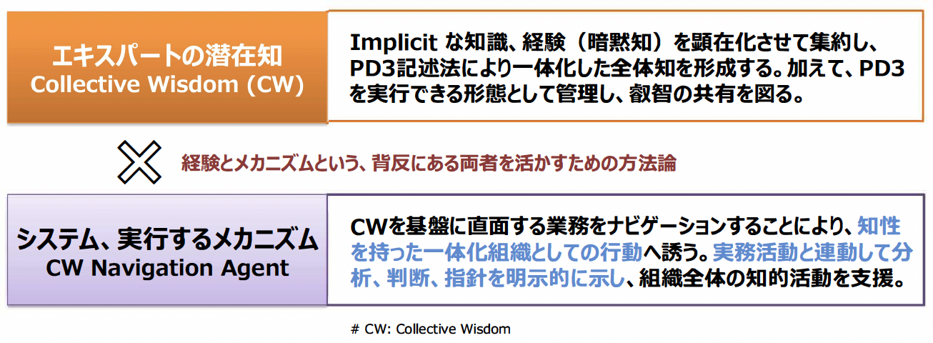 PD3による知識記述を通じて暗黙知を顕在化させて、集合知、全体知を造り上げる。その全体知を幅広いエ ー ンジニアに対する共通な価値創造プロセスとしてナビゲ ションし、組織全体を一体化した知的活動として推進。